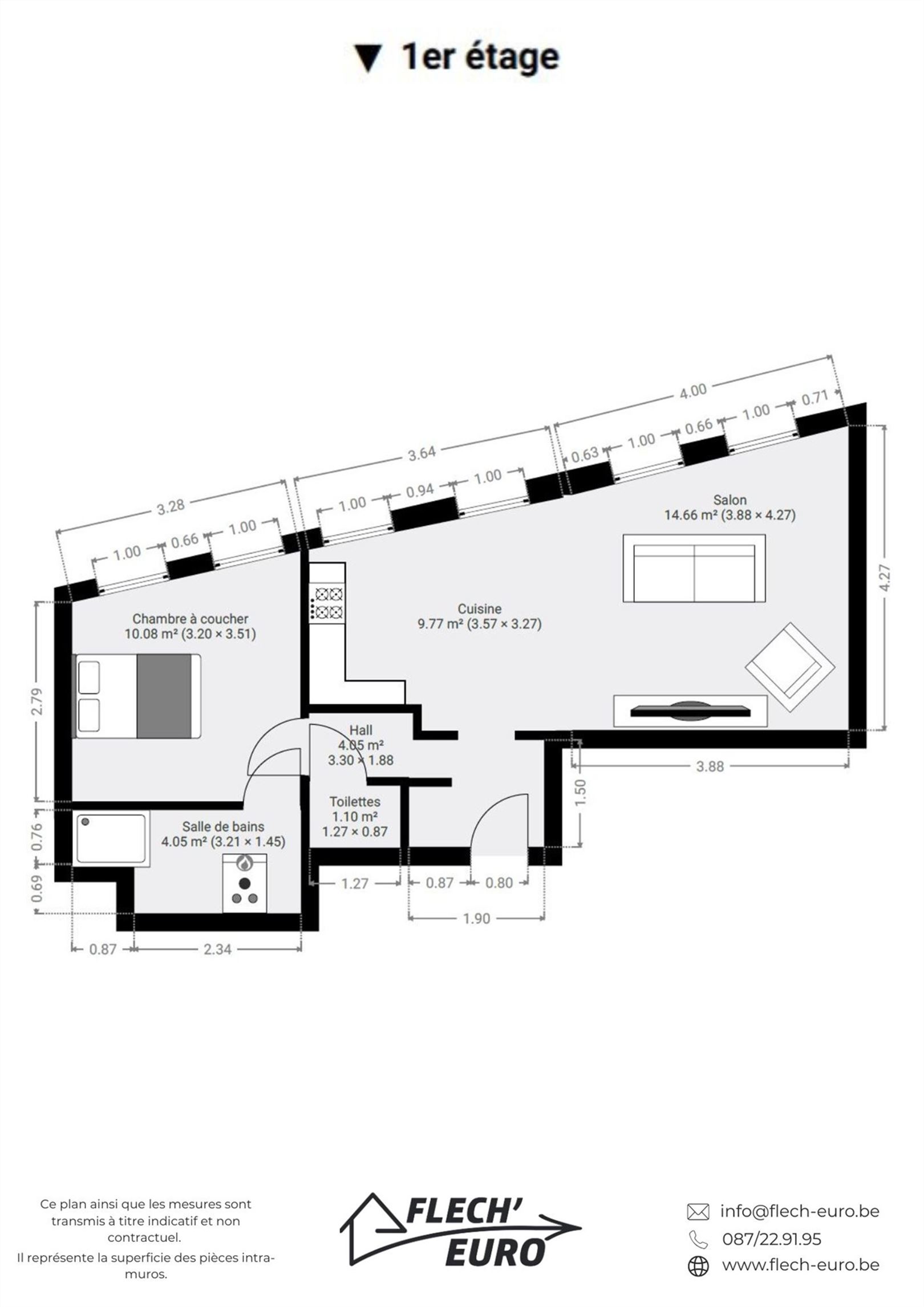 Appartement situé dans le centre ville de Verviers, proche de toutes commodités. Il est composé d'un hall, un séjour avec coin cuisine semi-équipée, une chambre à coucher, une salle de douche et un wc séparé. Idéal pour une personne seule.