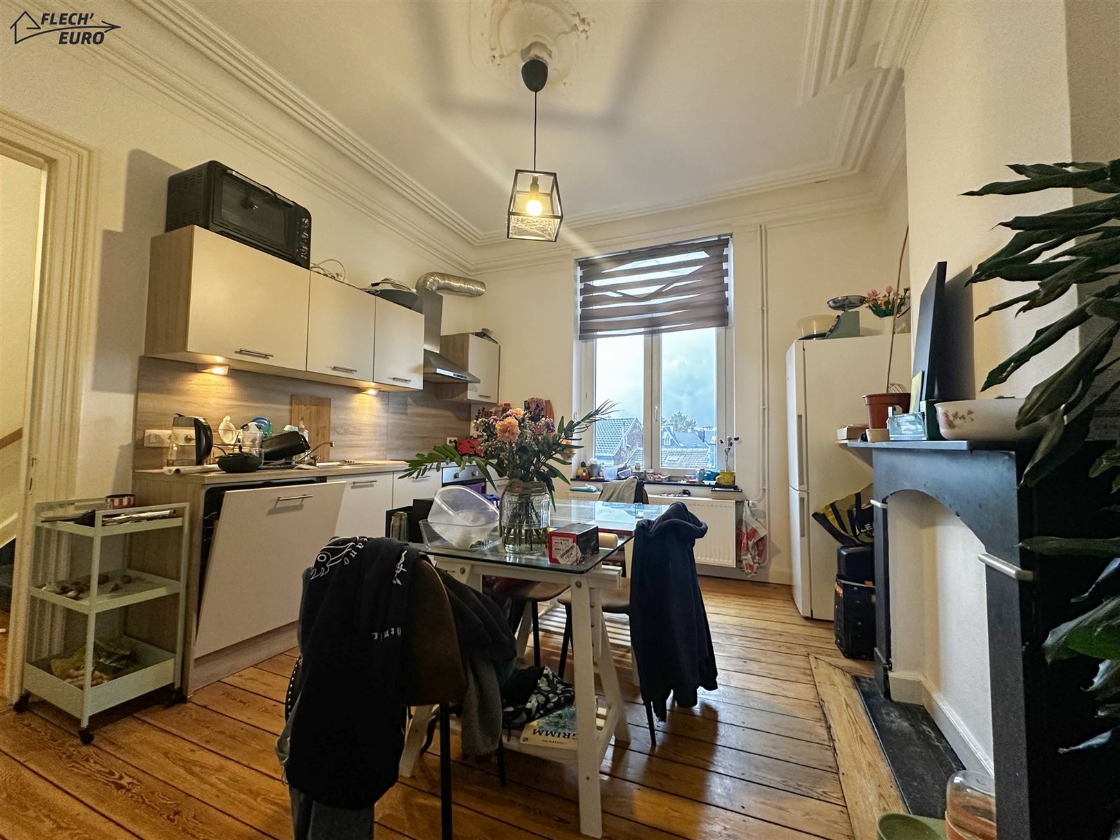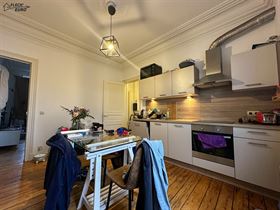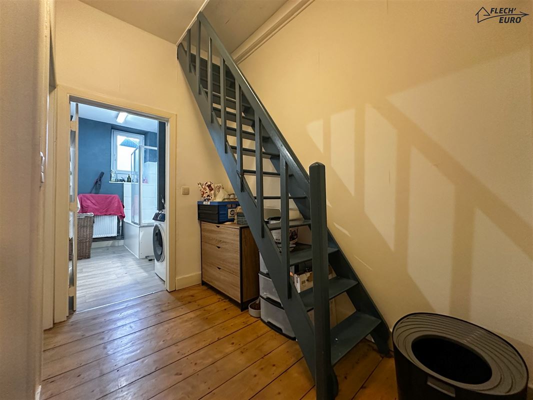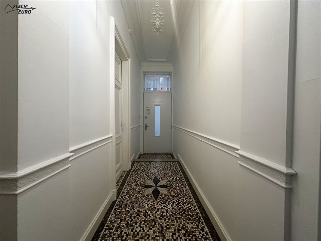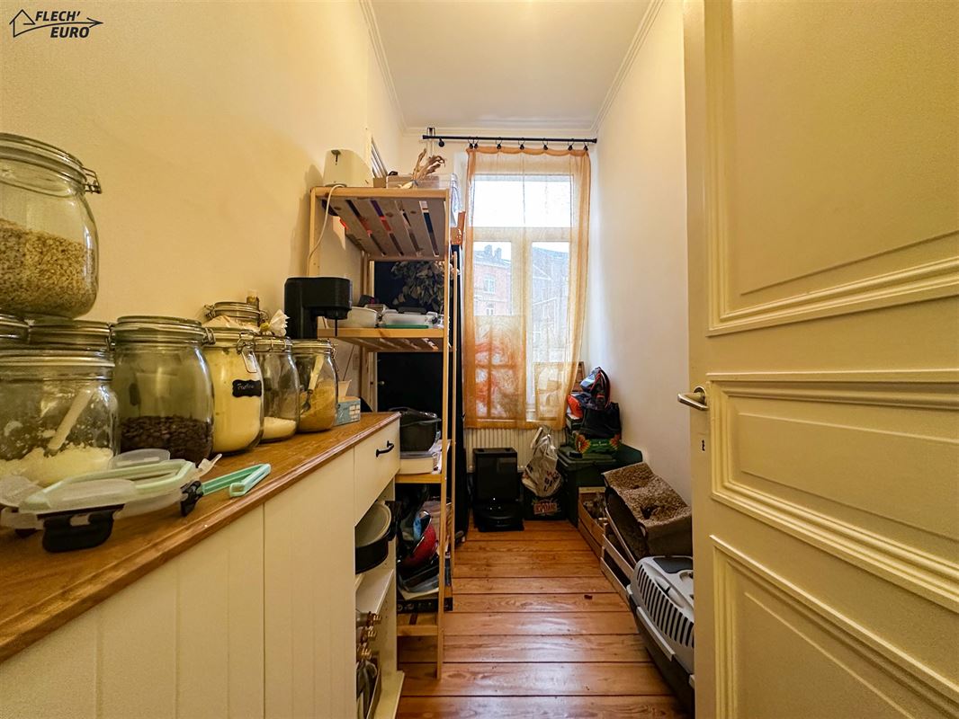 Dans une maison de maître, duplex rempli de charme, alliant parquet et moulures. Il se compose, au premier étage, d'un hall d'entrée, une cuisine hyper-équipée (frigo, four, taque de cuisson, hotte, évier, lave-vaisselle), un salon et un bureau/débarras. Au deuxième étage, d'un hall de nuit, deux grandes chambres à coucher et une salle de bain ainsi qu'un WC privatif à l'entresol. Des caves communes et un grenier privatif viennent compléter le bien et offrent un important volume de rangement. Le bien bénéficie de compteurs séparés, de châssis double vitrage en PVC & bois dans l’ensemble du logement et d’un chauffage central au gaz.
