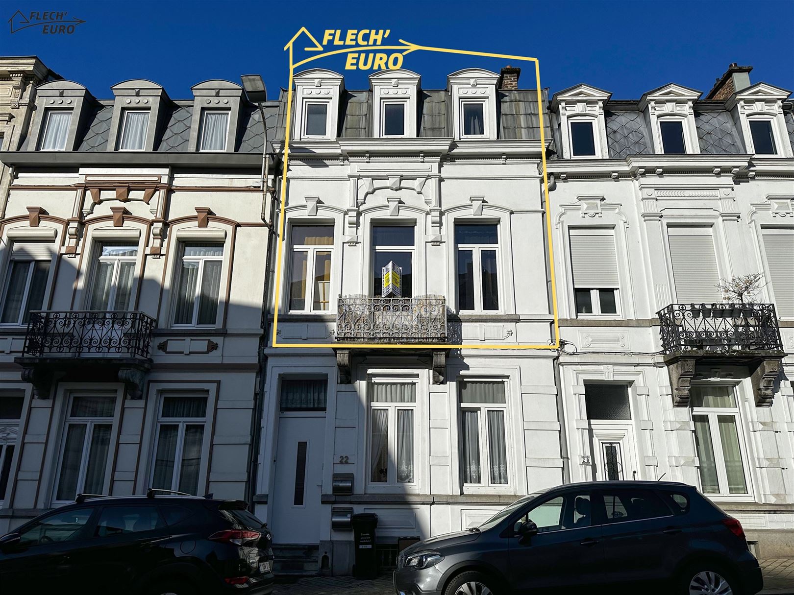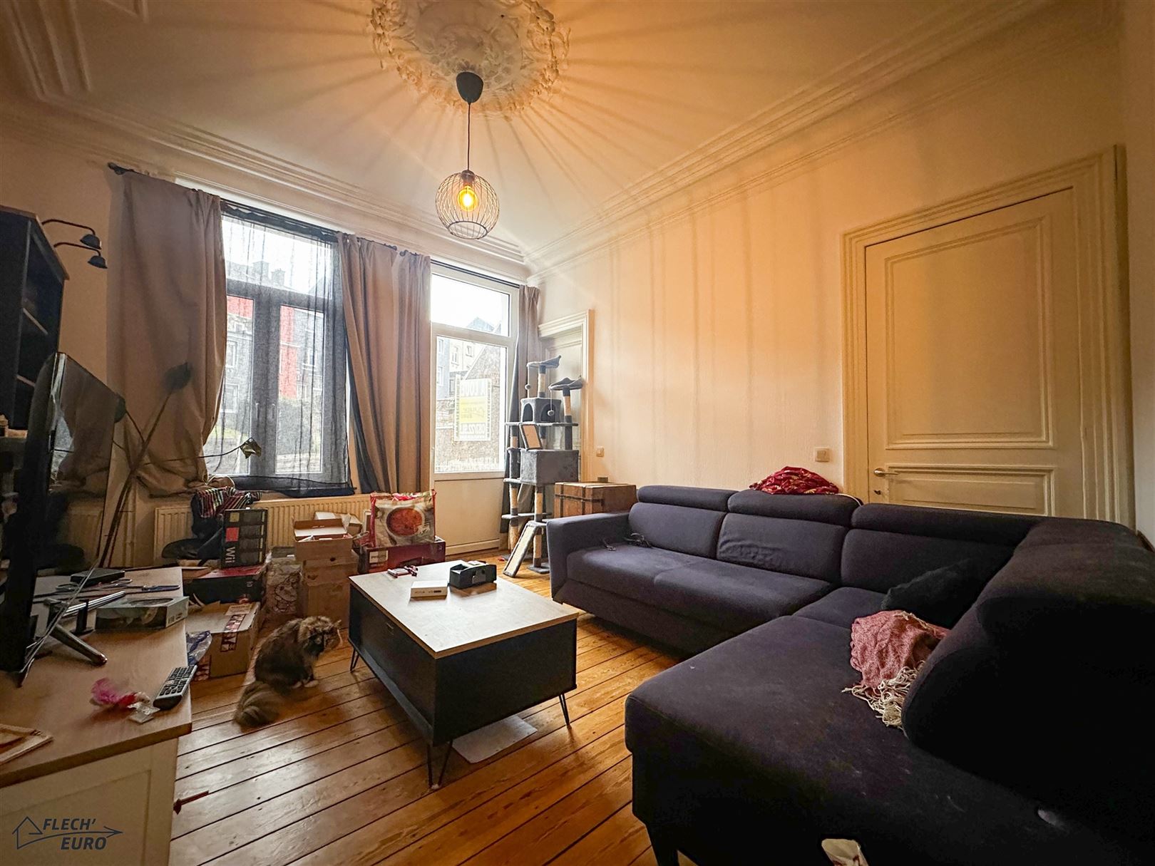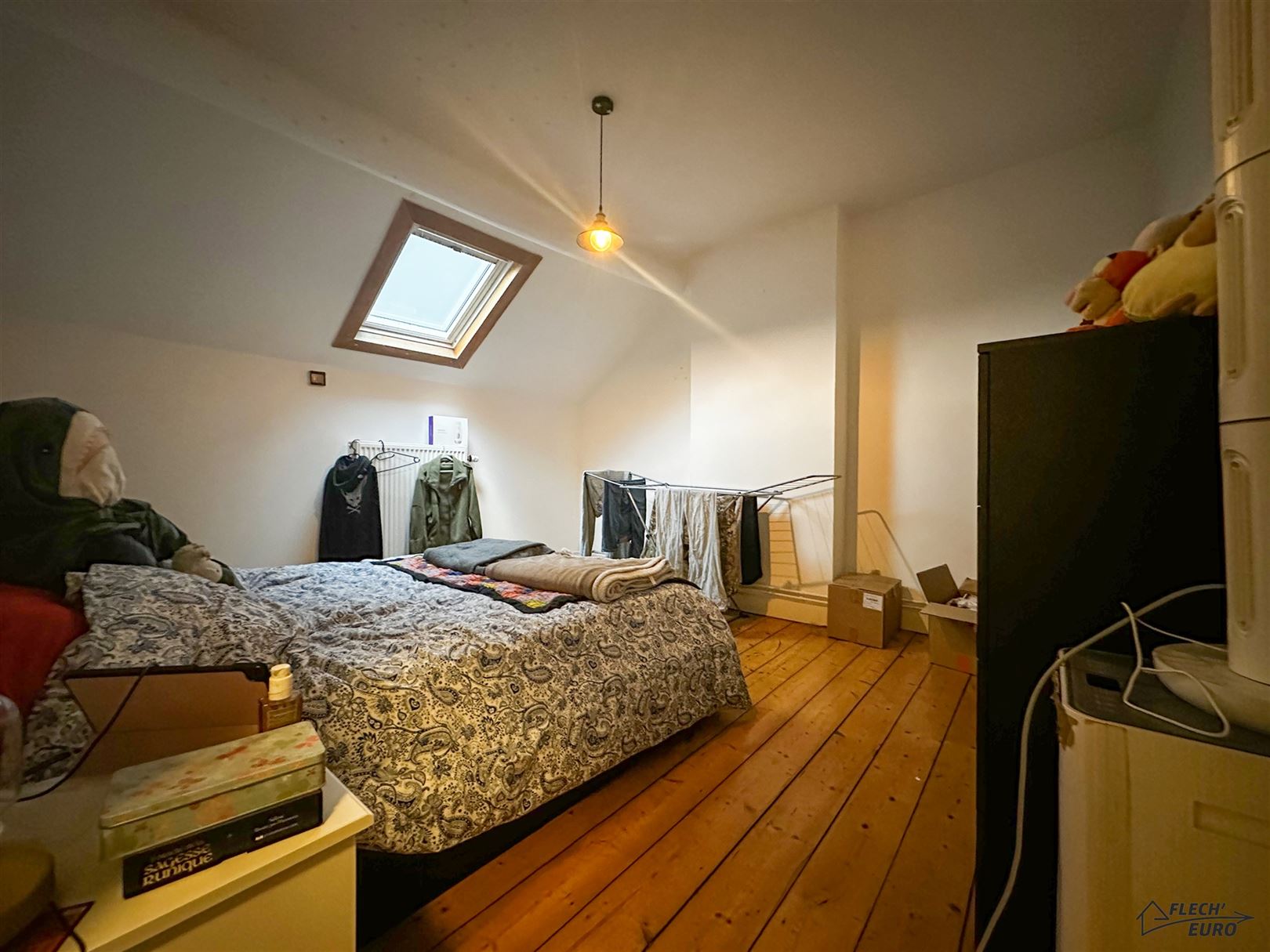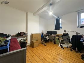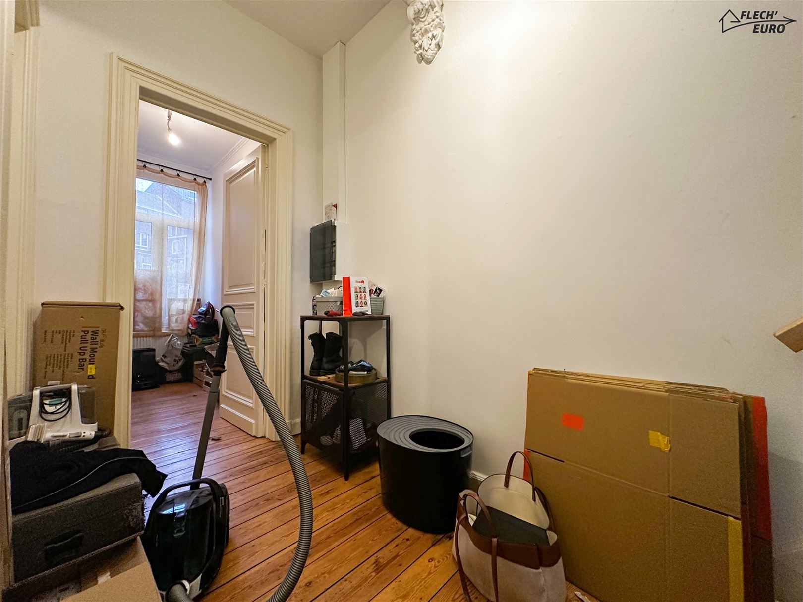 Dans une maison de maître, duplex rempli de charme, alliant parquet et moulures. Il se compose, au premier étage, d'un hall d'entrée, une cuisine hyper-équipée (frigo, four, taque de cuisson, hotte, évier, lave-vaisselle), un salon et un bureau/débarras. Au deuxième étage, d'un hall de nuit, deux grandes chambres à coucher et une salle de bain ainsi qu'un WC privatif à l'entresol. Des caves communes et un grenier privatif viennent compléter le bien et offrent un important volume de rangement. Le bien bénéficie de compteurs séparés, de châssis double vitrage en PVC & bois dans l’ensemble du logement et d’un chauffage central au gaz.